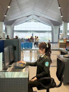 Ảnh: Đồng chí Dương Thị Ngọc Hằng – cán bộ Đội An ninh hàng không – Cảng hàng không quốc tế Vinh đang làm nhiệm vụ